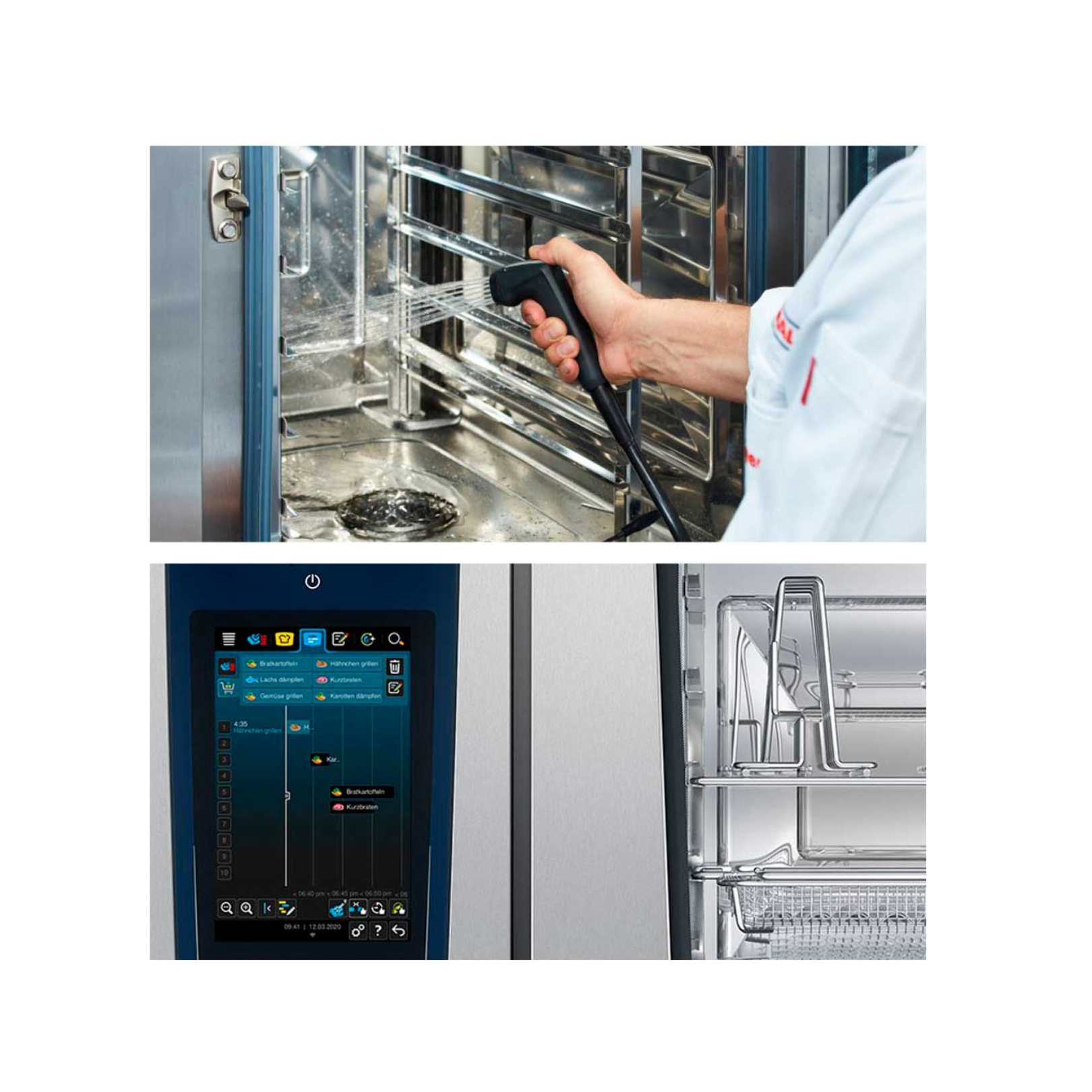 Funciones inteligentes: Gestión del clima con medición, regulación de humedad, fluidización dinámica del aire, regulación inteligente de las secuencias de cocción, control y cálculo del dorado, planificación procesos de cocción y cargas mixtas, visualización del estado de limpieza, etc.