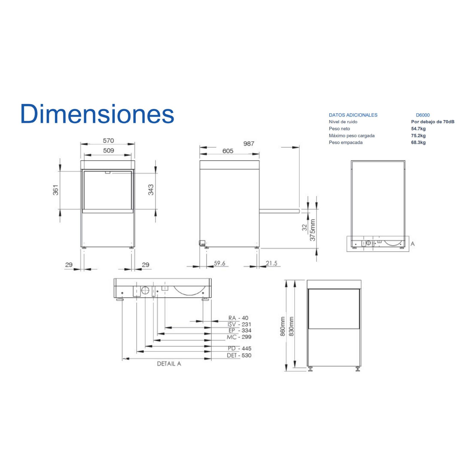 La D6000 para uso bajo mostrador es fácil de operar, cuenta con canastas de 500 x 500 mm que puede contener hasta 18platos de talla grande. Posee 3 programas de lavado, 40 seg, 55 seg y 180 seg, asegurando una solución óptima de limpieza en un formato estándar de equipo.