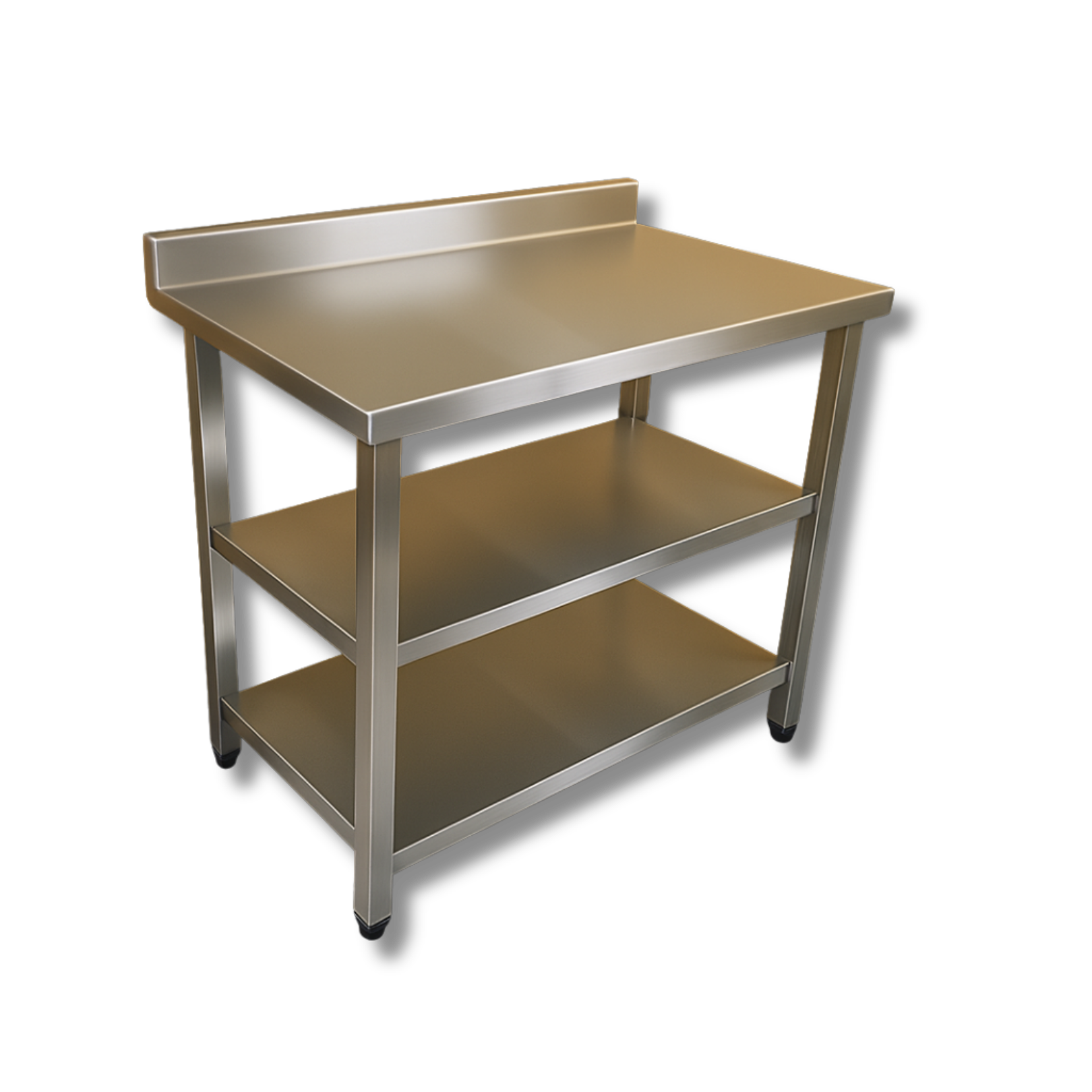 Nuestra mesa de trabajo en acero inoxidable AISI-304 calibre 18 con piso reforzado en omegas de acero inoxidable AISI-304 calibre 20 y un entrepaño adicional en acero inoxidable AISI-304 calibre 20 con omegas para reforzarlo es la solución ideal para quienes buscan una mesa robusta, resistente y funcional. Con un diseño que garantiza durabilidad, estabilidad y fácil mantenimiento, esta mesa es perfecta para cocinas profesionales, talleres, laboratorios y áreas de trabajo industriales donde se requieren altos estándares de higiene y resistencia.