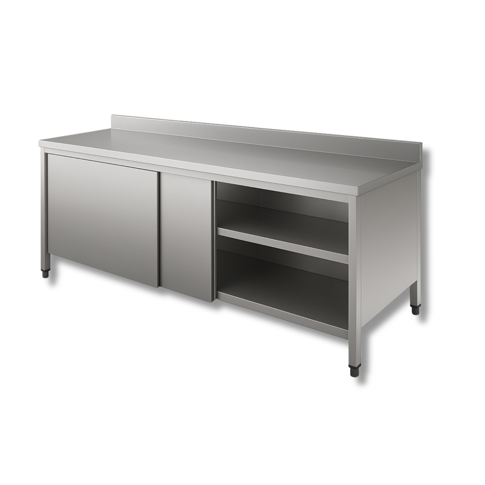 Nuestra mesa de trabajo tipo gabinete cerrado está fabricada en acero inoxidable AISI-304 calibre 18, con un piso reforzado en omegas de acero inoxidable calibre 20 y un entrepaño adicional del mismo material para mayor resistencia. Su diseño robusto, funcional y de fácil mantenimiento la hace ideal para cocinas profesionales, laboratorios, talleres y áreas industriales donde la higiene y durabilidad son fundamentales.