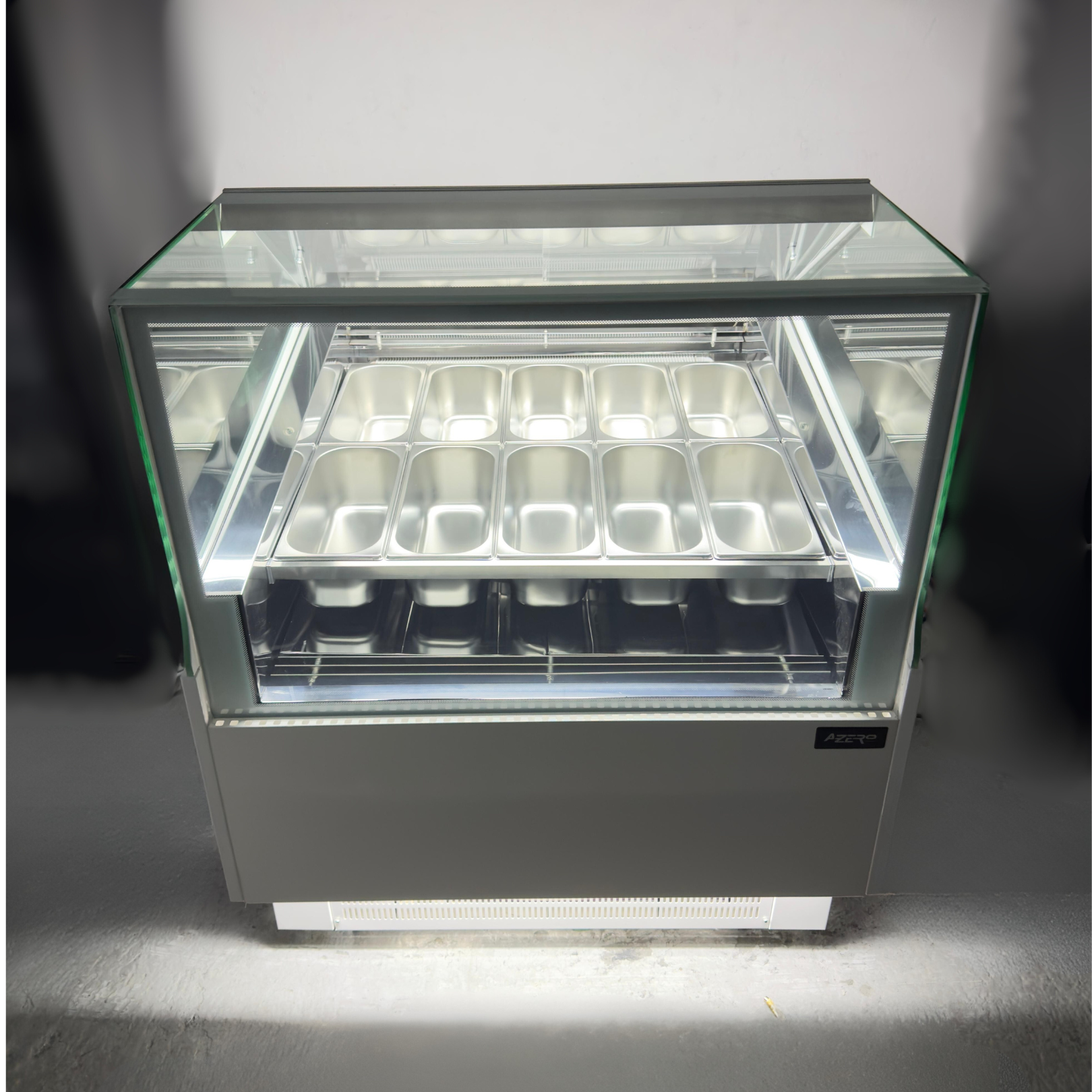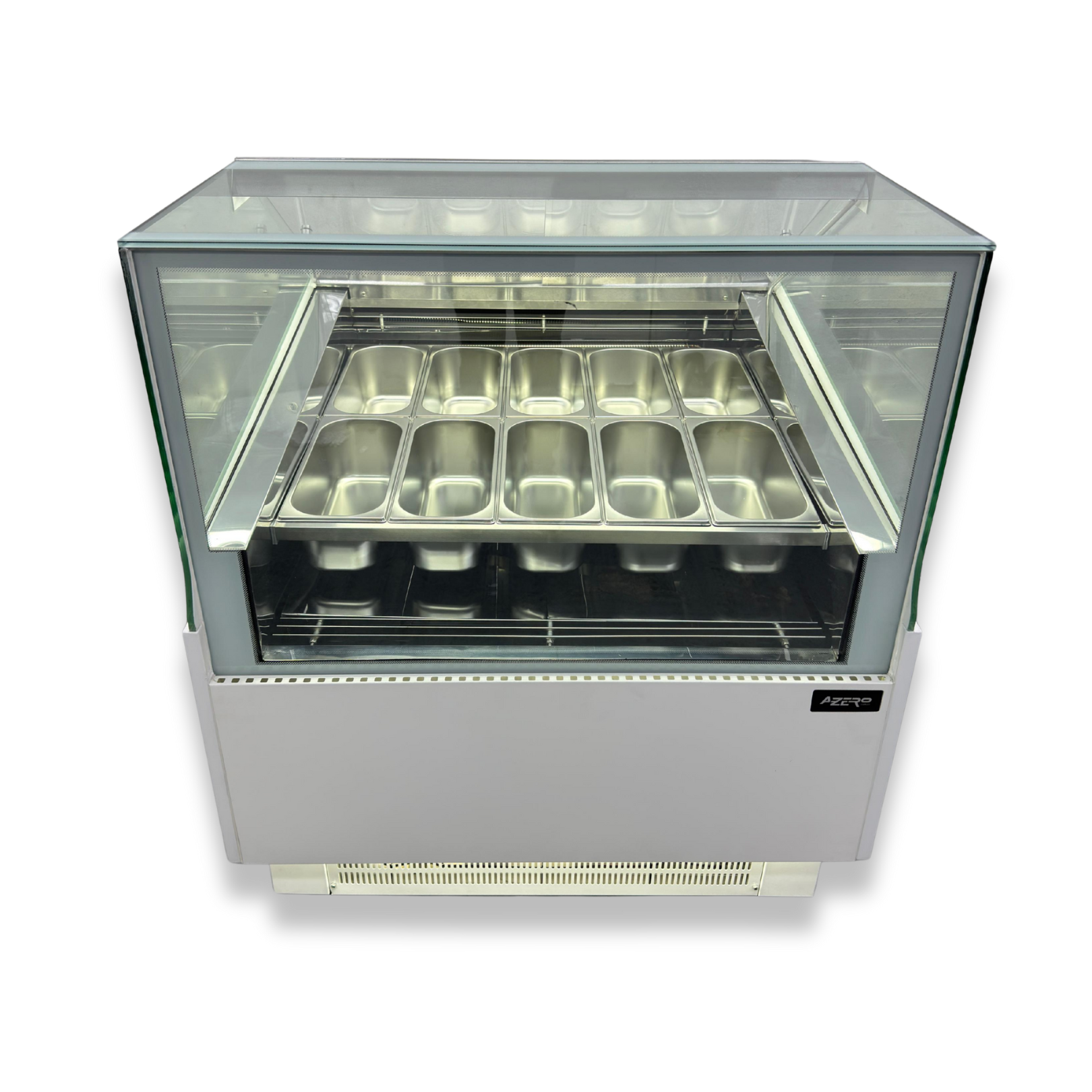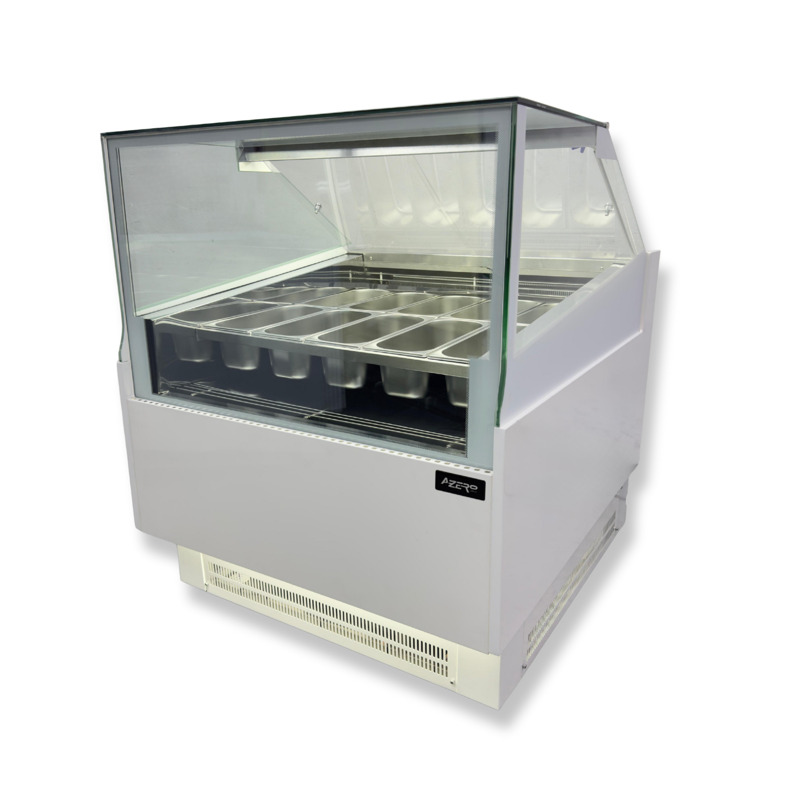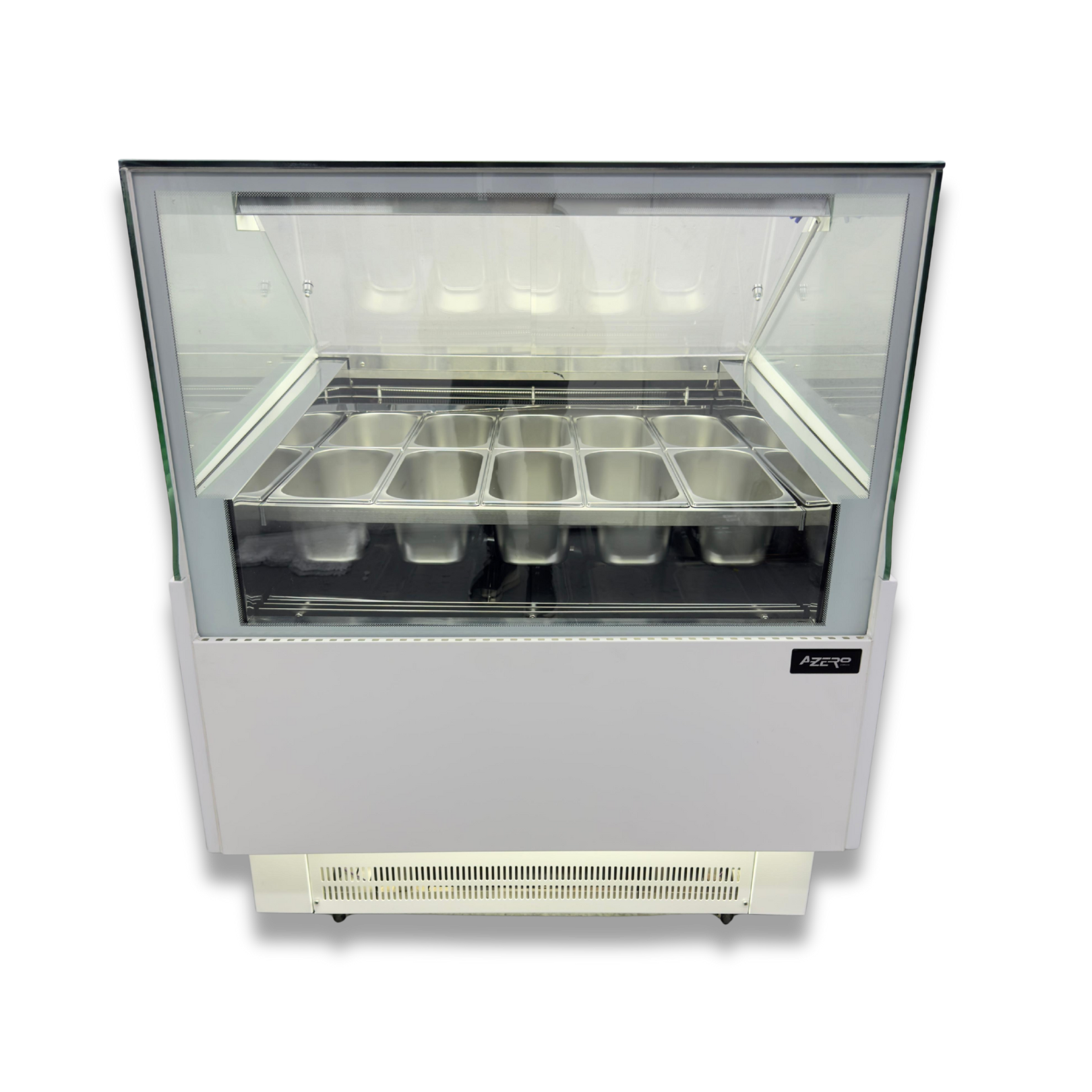 📏 Dimensiones: 1200 x 1150 x 1200 mm (Ancho – Fondo – Alto) 🍨 Capacidad: 12 azafates de acero inoxidable (360x165x120 mm) NOIncluidos o de Policarbonato transparentes (360x165x120 mm) NO incluidos 🌡️ Rango de temperatura ajustable: -14°C a -23°C ❄️ Compresor: Embraco R-507