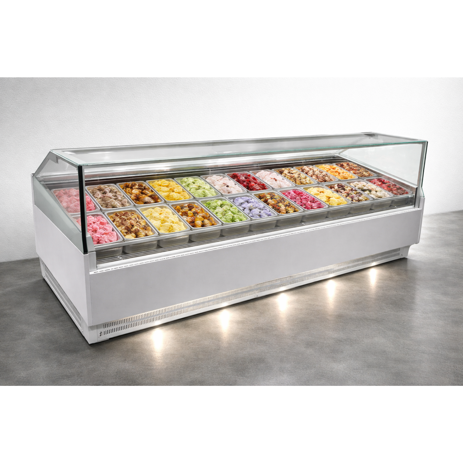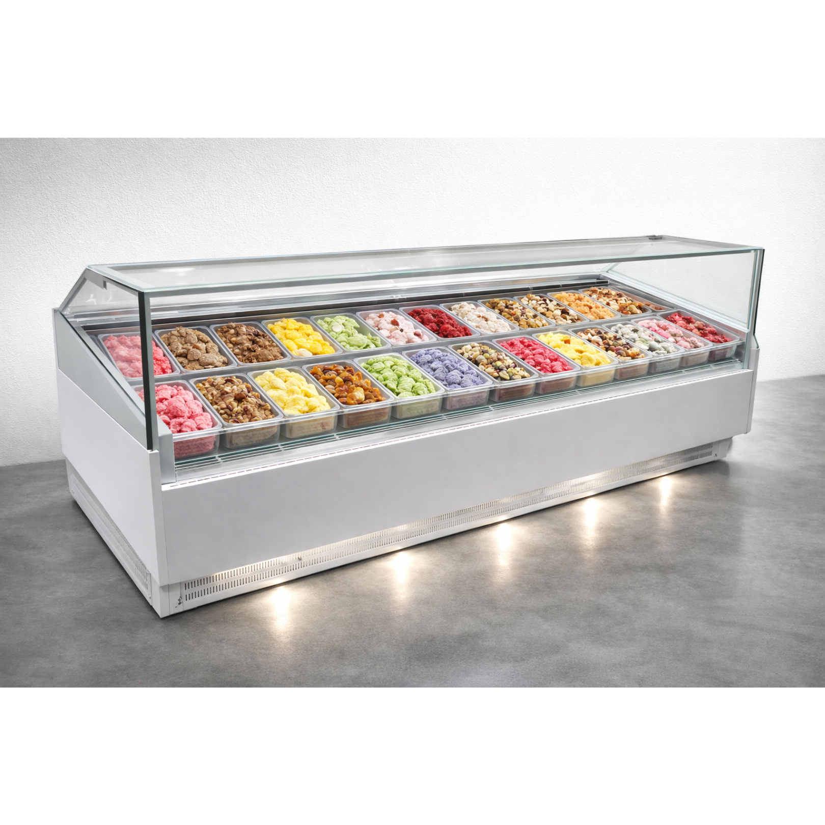 Lleva la exhibición de tus Helados o Gelato al siguiente nivel con nuestra Vitrina Expositora de Diseño Italiano, creada para ofrecer máxima visibilidad, conservación óptima y eficiencia energética. Su tecnología avanzada y materiales de alta calidad garantizan un rendimiento excepcional, resaltando cada sabor de manera irresistible.