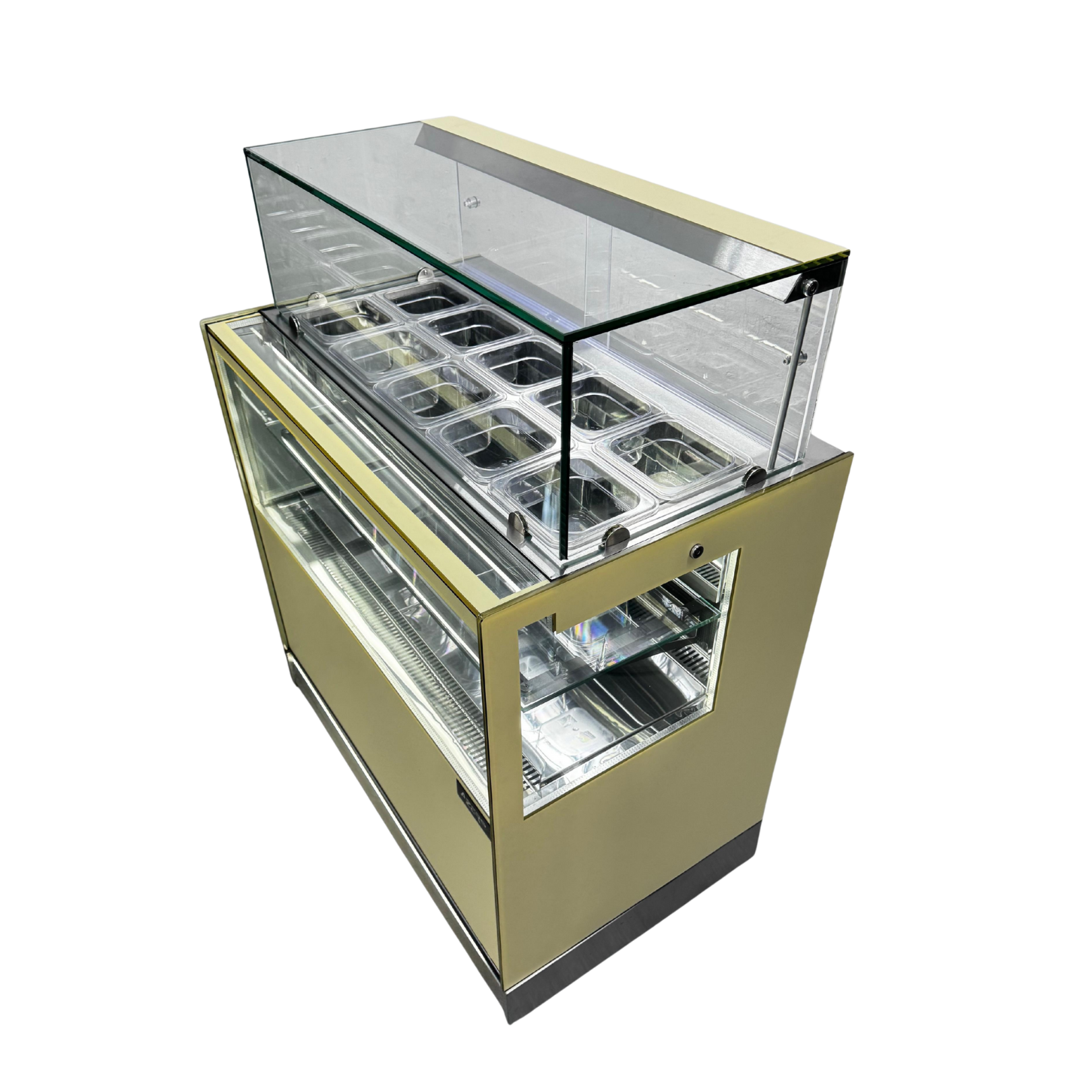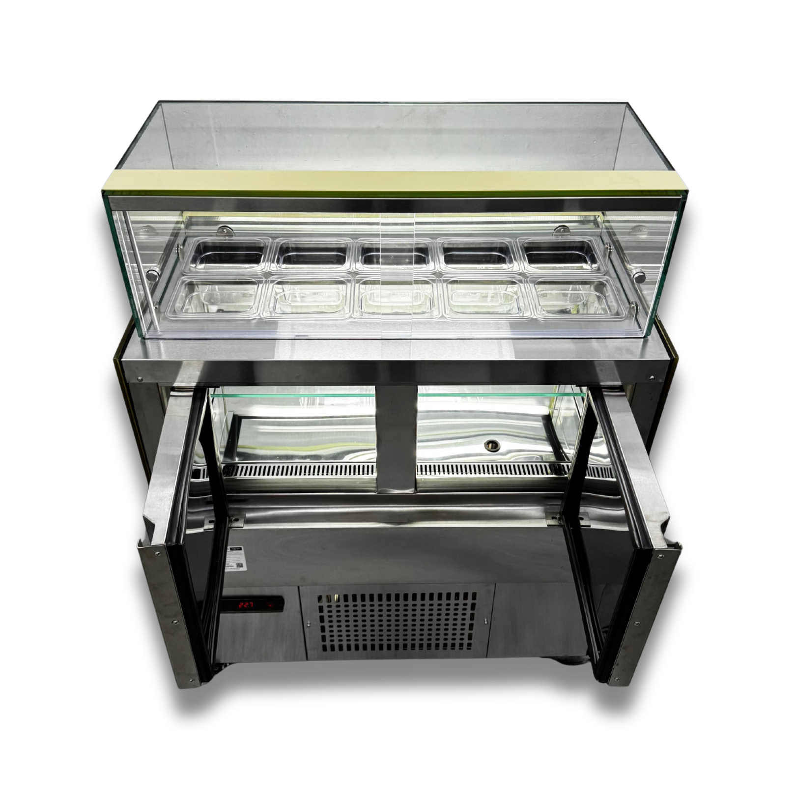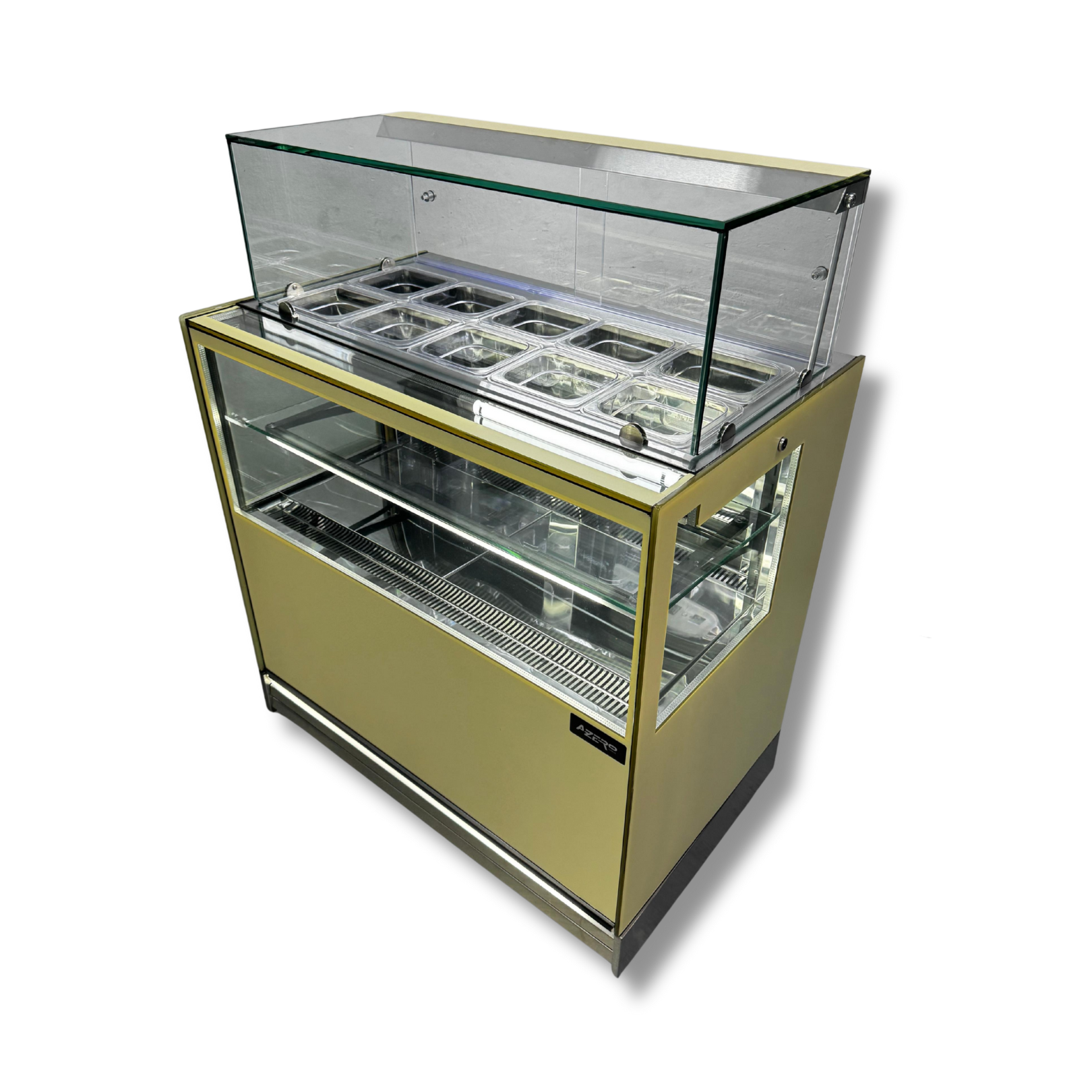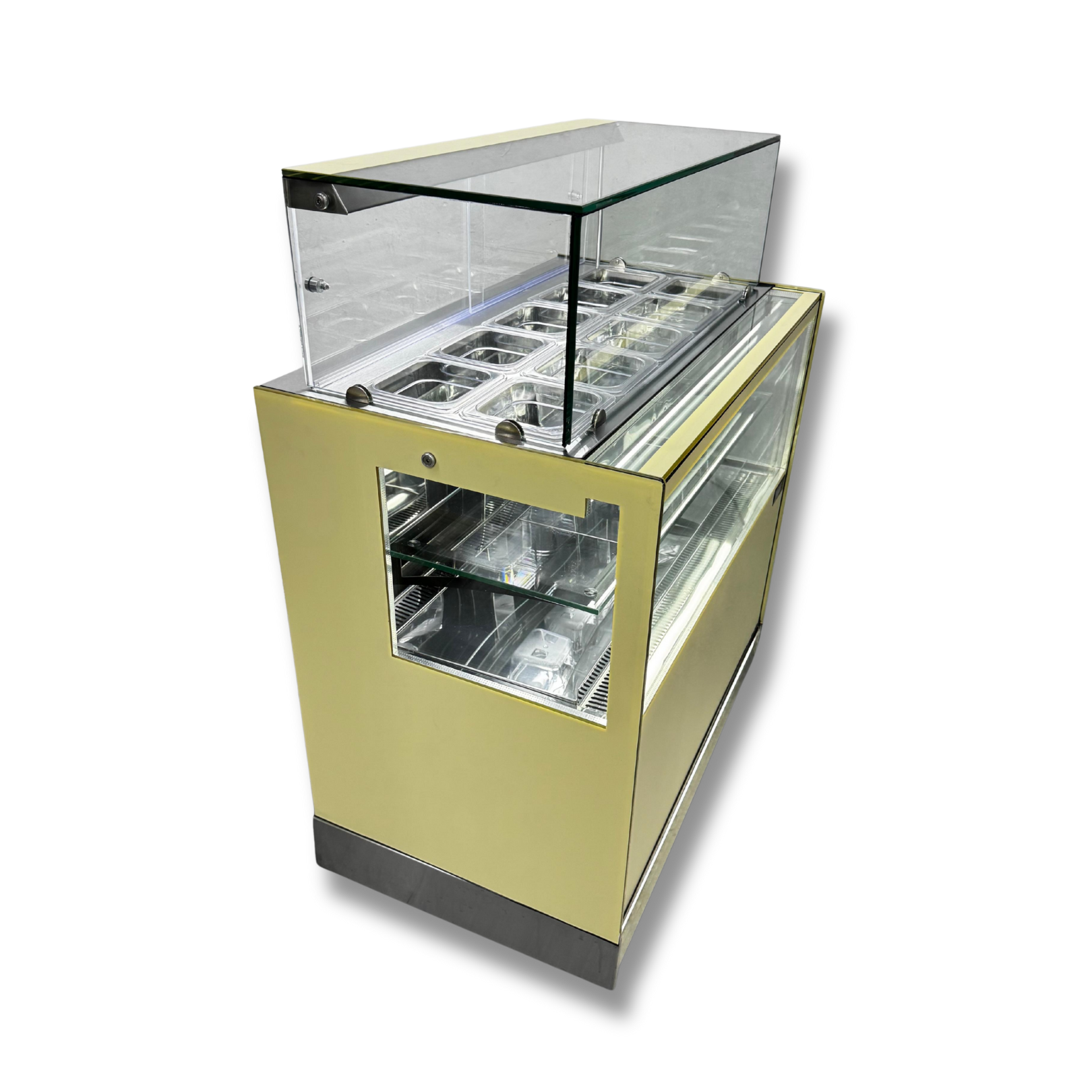 Optimiza la presentación y conservación de tus toppings con nuestra Vitrina refrigerada para Toppings. Esta vitrina está diseñada para mantener frescos y accesibles una variedad de ingredientes para tus helados, yogurt helado u otros postres congelados. Con capacidad para 8 azafates refrigerados, ofrece espacio suficiente para una selección diversa de frutas frescas. La puerta de acceso proporciona una fácil reposición de los productos y un acceso conveniente al almacenamiento adicional. Además, su diseño refrigerado garantiza que los toppings se mantengan frescos y listos para su uso durante todo el servicio. Construida con materiales duraderos y un diseño robusto, esta vitrina refrigerada es ideal para entornos comerciales de alto tráfico. Mejora la experiencia del cliente y agiliza la preparación de tus postres congelados.