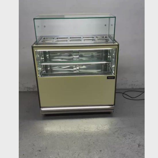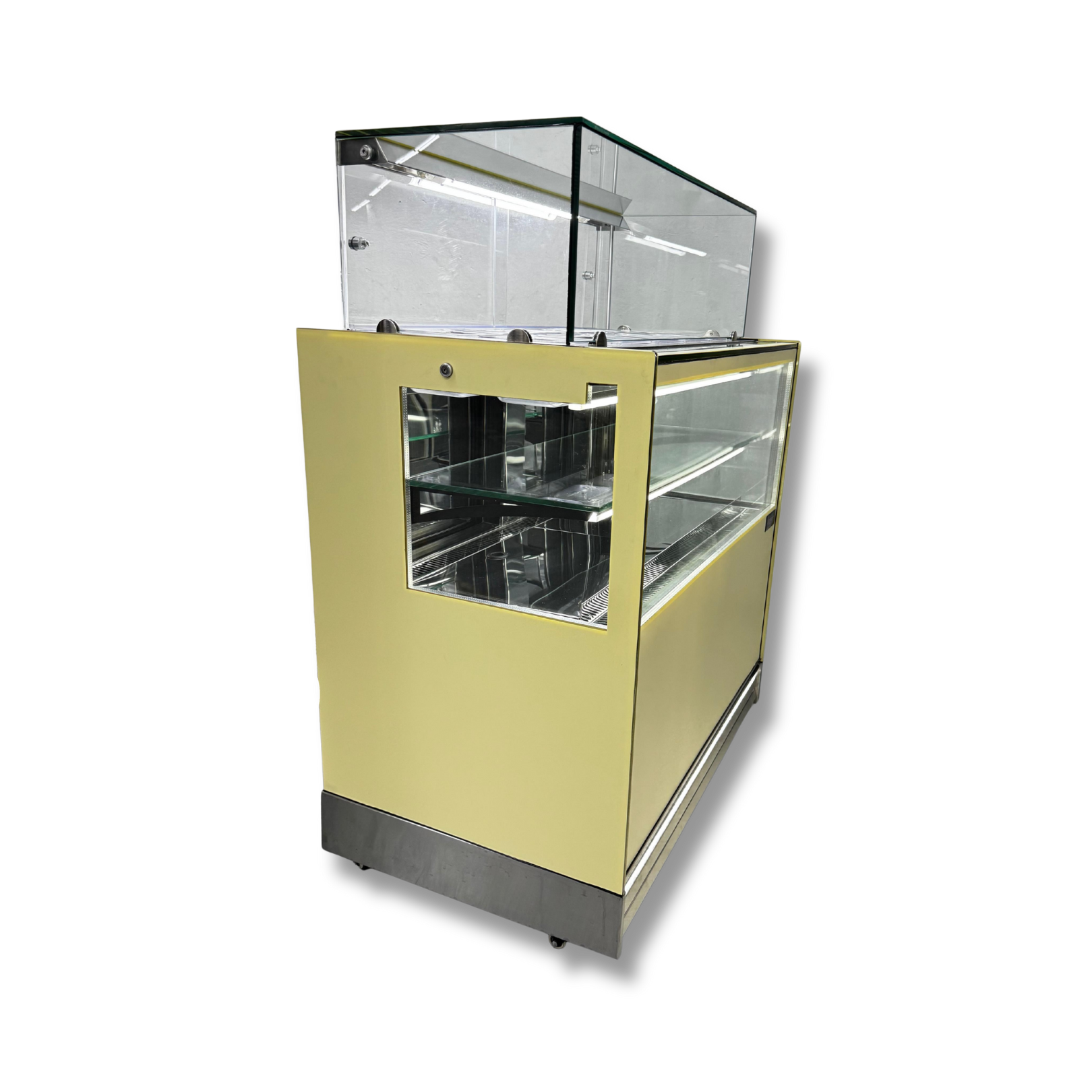 Vitrina refrigerada de dos niveles con puertas batientes con manija empotrada en acero inoxidable.