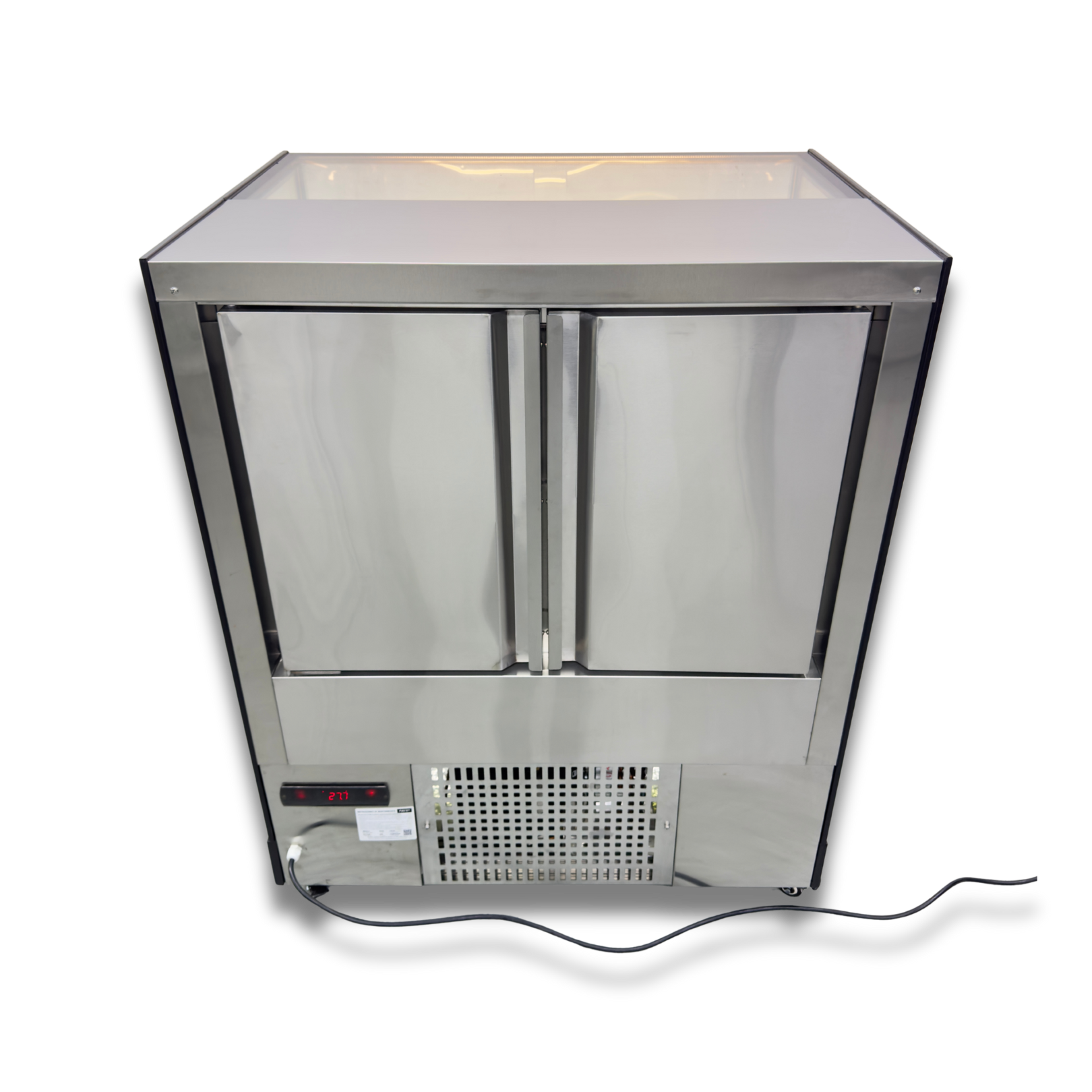 ✅ Dimensiones: 100 x 72 x 120 cm (Frente - Fondo - Alto) ✅ Materiales de alta calidad: Interior y exterior en acero inoxidable AISI 430 (opcional AISI 304). ✅ Puertas batientes en acero inoxidable para mayor durabilidad y fácil acceso. ✅ Panel de vidrio frontal y superior con resistencia activable en días húmedos, evitando empañamiento y asegurando una exhibición impecable. ✅ Vidrios templados laterales para una mejor visibilidad y eficiencia energética. ✅ 2 entrepaños de vidrio templado de 10 mm, ideales para una exhibición elegante y ordenada. ✅ Iluminación LED con lente opal en cada entrepaño, resaltando los colores y texturas de tus productos. ✅ Sistema de refrigeración por aire forzado para una distribución uniforme del frío. ✅ Compresor de alto rendimiento de 1/3 HP (marca EMBRACO o equivalente). ✅ Control de temperatura electrónico para mantener condiciones óptimas de conservación. ✅ Ruedas con freno para facilitar su movilidad y estabilidad.