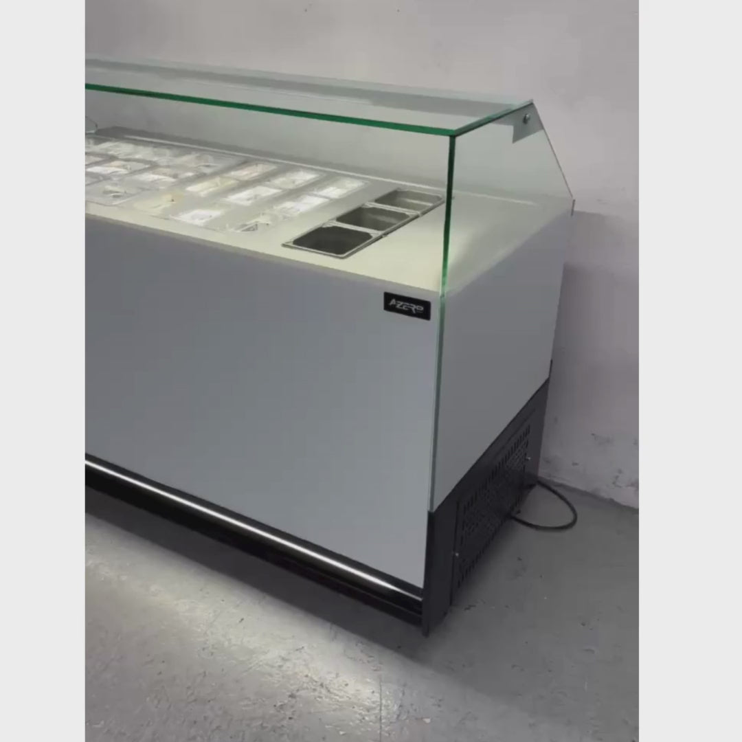Optimiza la exhibición y conservación de tus toppings para helados, yogur helado y postres con la vitrina refrigerada para toppings AZ-VT12R12N3C EVO Diseñada para negocios de alto tráfico, esta vitrina garantiza la frescura y presentación de tus ingredientes con 12 compartimentos refrigerados y 12 compartimentos neutros (sin frío). Ideal para toppings como frutas frescas, salsas, chispas de chocolate, frutos secos y más. y 3 compartimientos calientes para salsas de chocolate.
