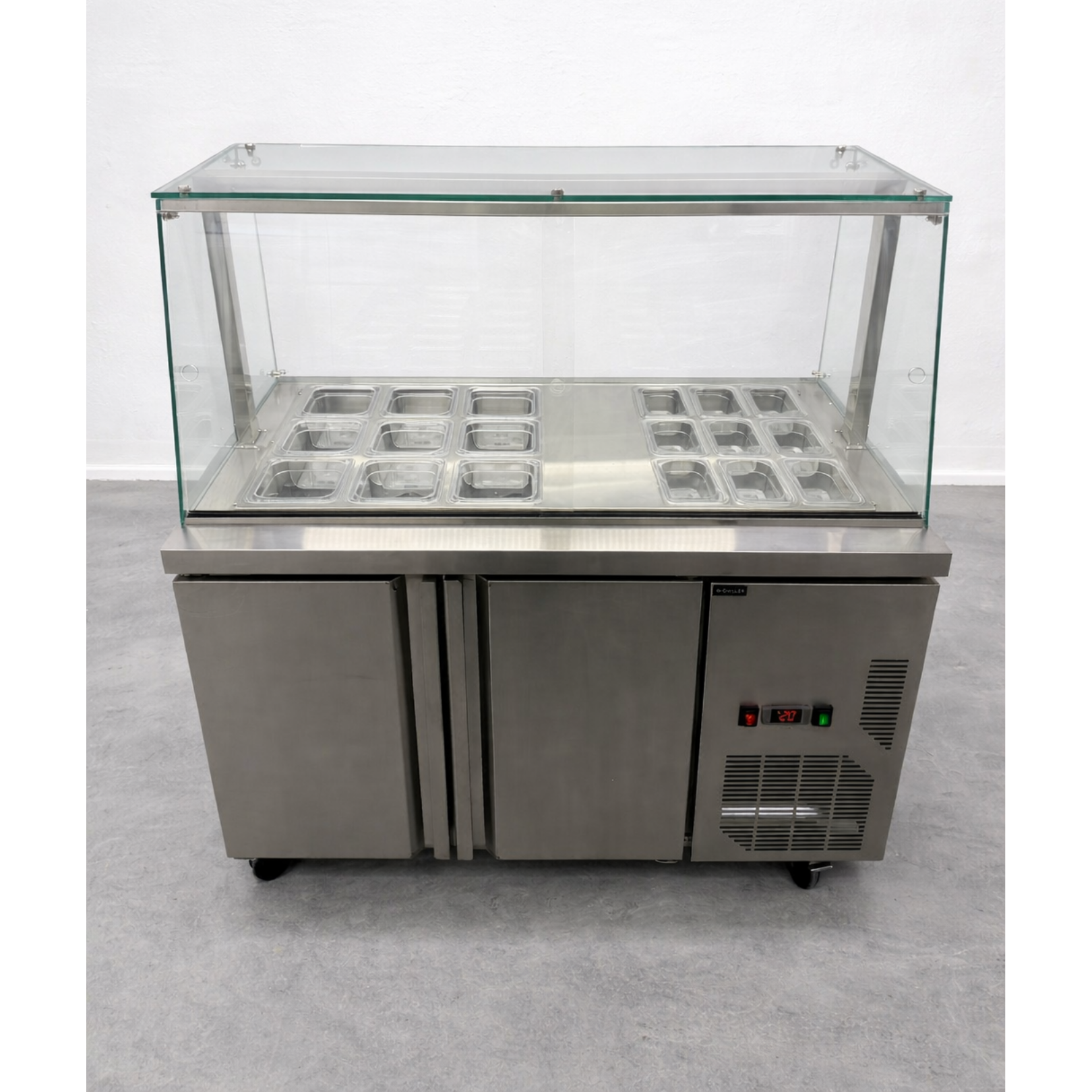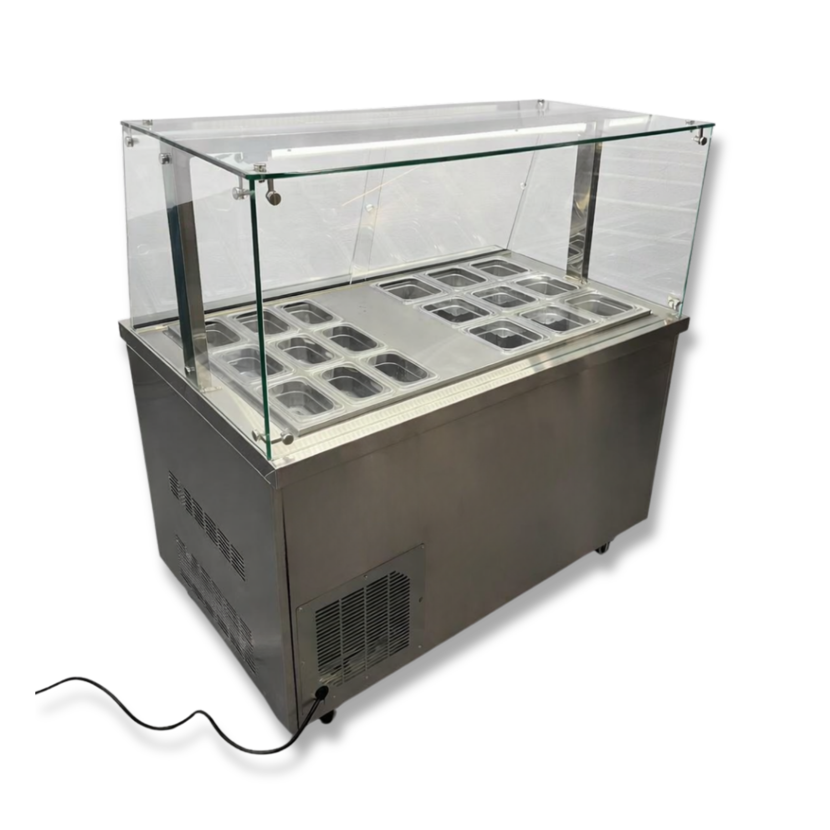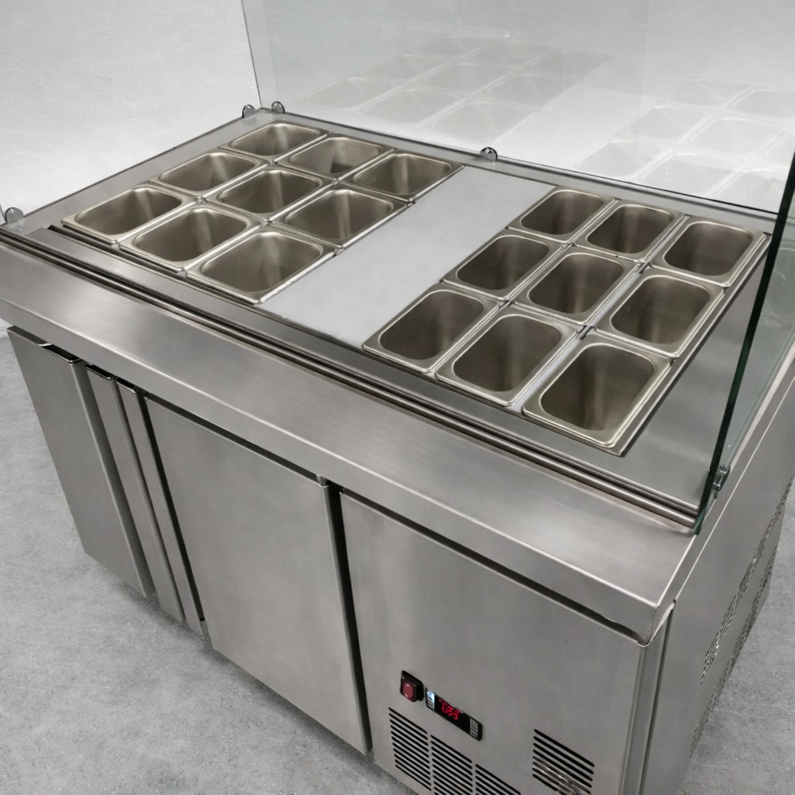 Optimiza la presentación y conservación de tus toppings con nuestra Vitrina refrigerada para Toppings. Esta vitrina está diseñada para mantener frescos y accesibles una variedad de ingredientes para tus helados, yogurt helado u otros postres congelados. Con capacidad para 18 azafates, ofrece espacio suficiente para una selección diversa de toppings, desde frutas frescas hasta dulces y salsas. La puerta de acceso proporciona una fácil reposición de los productos y un acceso conveniente al almacenamiento adicional. Además, su diseño refrigerado garantiza que los toppings se mantengan frescos y listos para su uso durante todo el servicio. Construida con materiales duraderos y un diseño robusto, esta vitrina refrigerada es ideal para entornos comerciales de alto tráfico. Mejora la experiencia del cliente y agiliza la preparación de tus postres congelados.