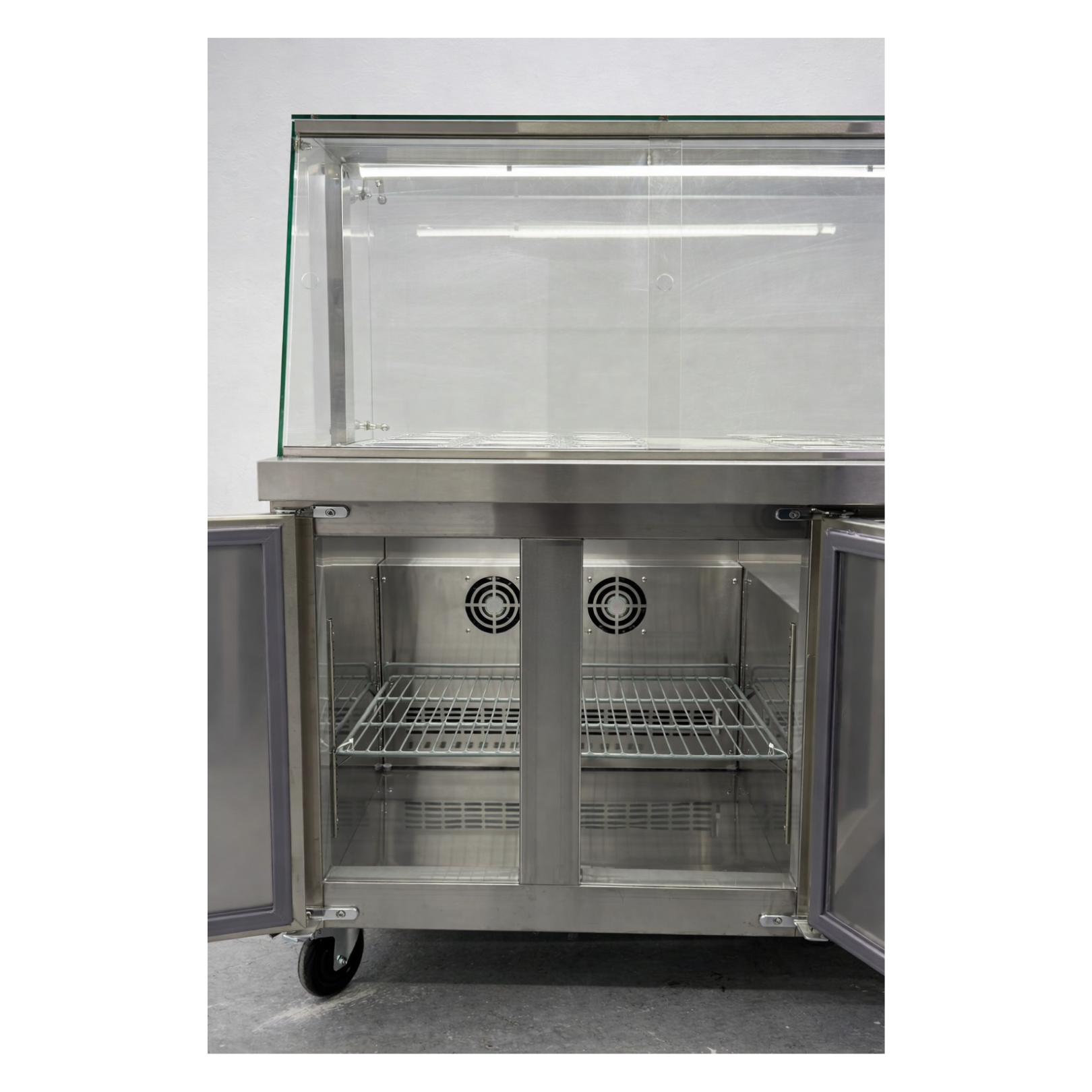 2 Puertas para acceso a la bodega inferior refrigerada con capacidad para 350 litros.